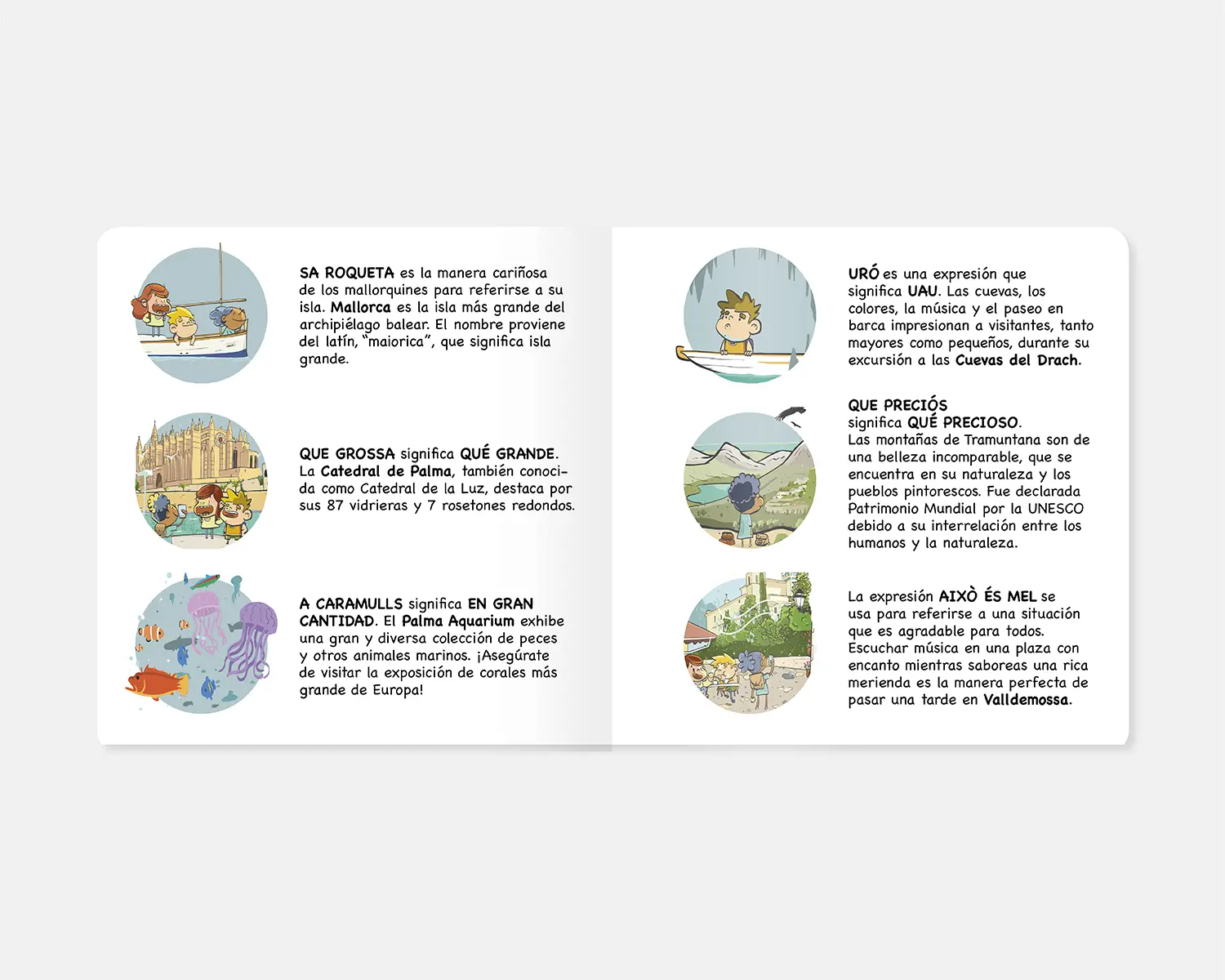 Hi ha molt a veure i fer a Mallorca! Des de bonics pobles a platges impressionants, amb delicioses menges i viatges amb tren, és l’illa perfecta per a petits viatgers. Aquest conte de cartró és ideal per donar a conèixer l’illa de Mallorca als viatgers més joves i endur-se un record de la seva experiència. Amb les seves divertides il·lustracions podràs acompanyar els tres protagonistes per les seves aventurespels llocs i experiències més recomanats per descobrir en família. Amb l’ajuda dels pares, els petits també podran aprendre expressions típiques de l’illa i curiositats de cadascun dels espais visitats, amb el glossari-guia al final del conte.