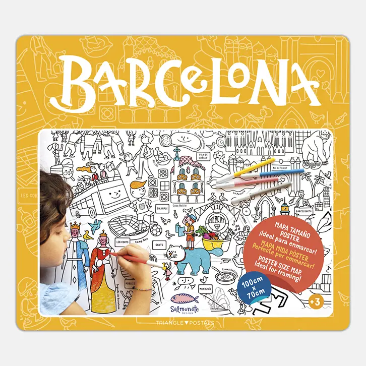 Coloriez la ville de Gaudí et du Barça! Une carte grand Format: pour que les enfants (et pas seulement), seuls ou accompagnés, puissent se baigner sur les plages de la ville; visiter les meilleurs édifices de Gaudí: la Sagrada Familia, la Casa Batlló ou la Pedrera; monter dans les attractions du Tibidabo; aller dans le stade du Barça; voir les animaux du zoo; se perdre dans les rues de la vieille ville : le quartier gothique, le Raval et la Barceloneta; et photographier la Fontaine Magique de Monjuïc. Vous serez occupés tout l’été!