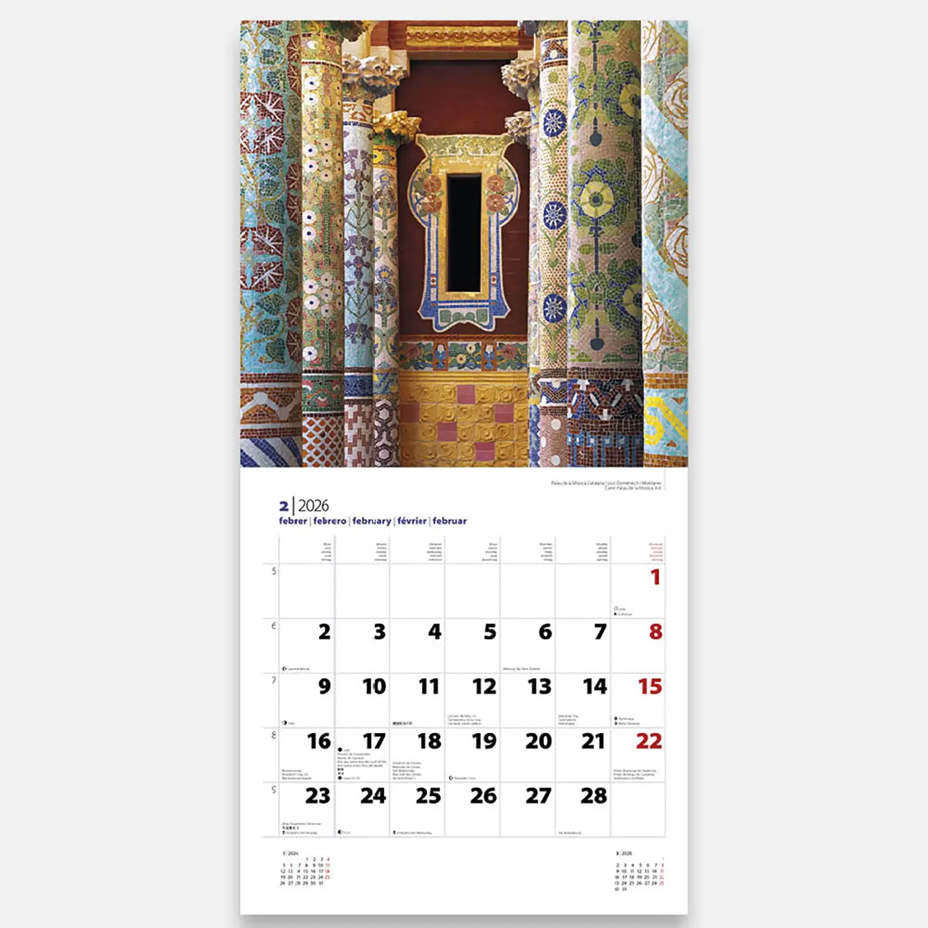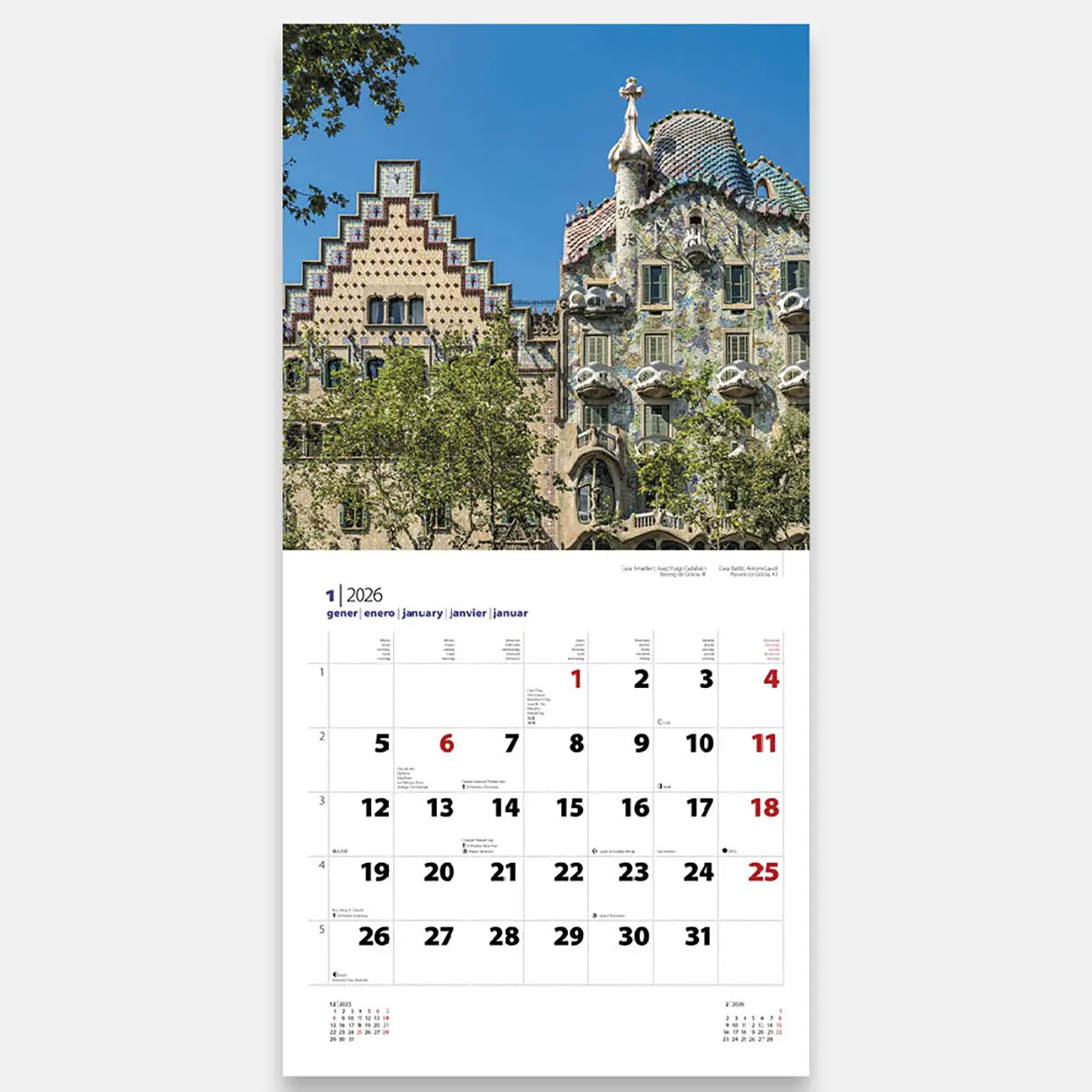 • Calendrier 2026 Gaudí B (S. Família). Découvrez l'œuvre fascinante de Gaudí grâce à ces 12 images qui vous rapprocheront de la magie des créations du génial architecte catalan.
