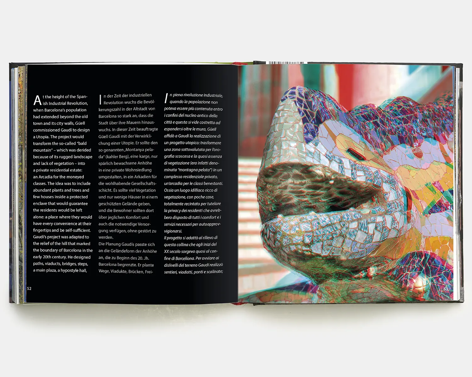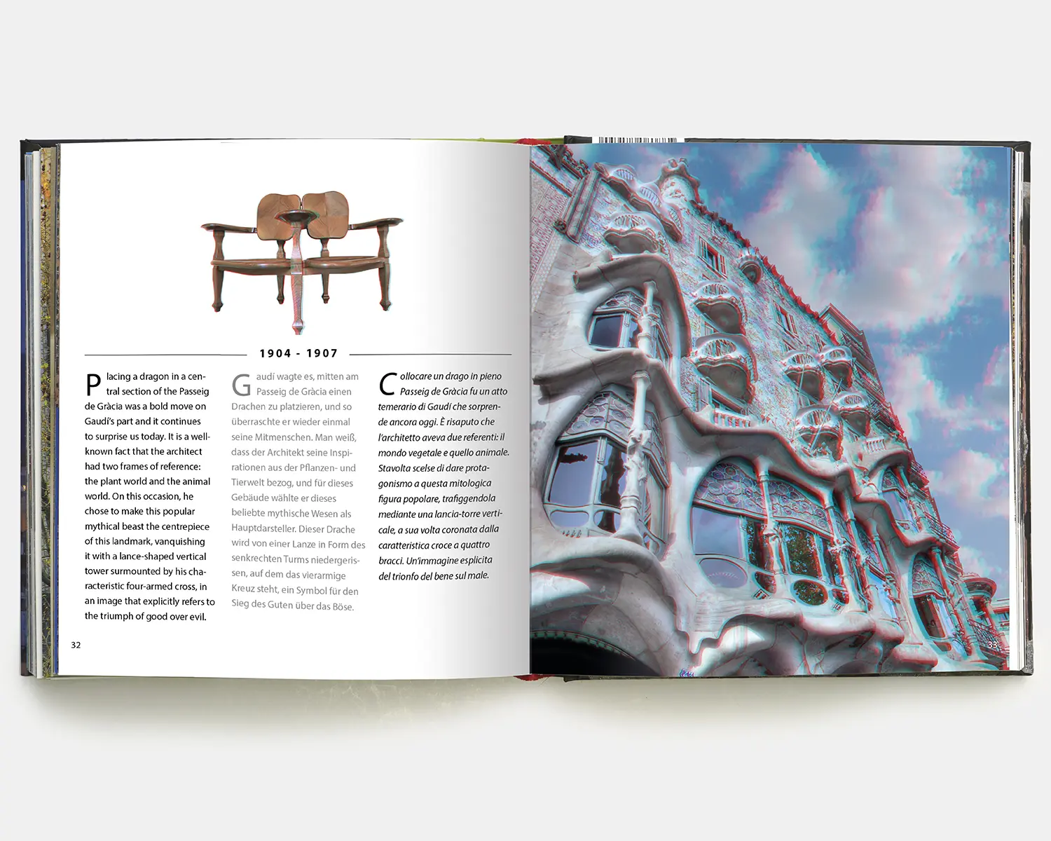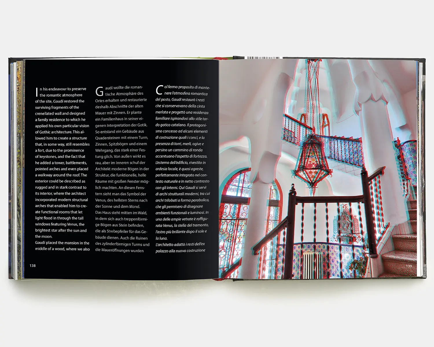 L’arquitectura de Gaudí ha estat fotografiada milers de vegades, però mai fins avui no ho havia estat en 3D, tècnica que no solament ens permet conèixer les seves obres sino que a més ens transporta al seu interior, per captar la dimensió dels seus espais, la morfologia dels seus objectes, el misteri de la seva llum, la intensitat dels seus colors, en definitiva, la màgia de tota la seva obra.